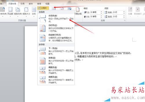 4、選擇“分隔符”。點(diǎn)擊其下拉菜單欄里的“分頁符”。