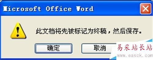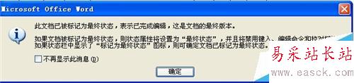 4、再次點擊“確定”,文檔的狀態屬性將被設置為“最終狀態”,并禁止任何人的編輯、修改或保存操作,而且會在狀態欄中顯示“標記為最終狀態”圖標。