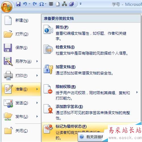 5、要取消“標記為最終狀態”,只需單擊“Office”按鈕,在彈出菜單中,點擊“準備”--“標記為最終狀態”