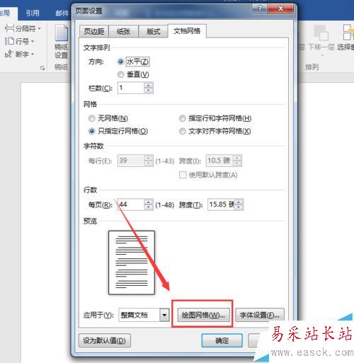 4、我們進入文檔網(wǎng)絡(luò)過后,我們可以看到這里可以文字排列、網(wǎng)絡(luò)、字符數(shù)、行數(shù)等等。不過這些都不是我們所需要的,我們這里需要點擊的就是繪圖網(wǎng)格,也就是在界面的右下方,下圖已經(jīng)標(biāo)出來了。