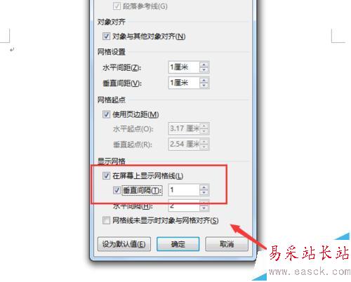 6、然后就是設(shè)置顯示網(wǎng)絡(luò),這里我們設(shè)置的垂直間隔和水平間隔,這個也就是我們在屏幕上顯示的網(wǎng)格線,這里的單位表示的就是網(wǎng)格設(shè)置的單位為最小單位。也就是說,上面設(shè)置的是2厘米,那么下面一個單位就表示2厘米。