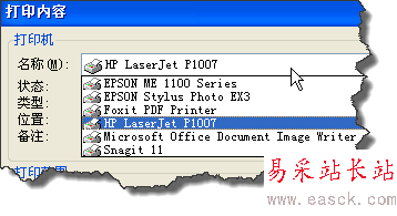 3、在“打印內容”窗口選擇好你的黑白打印機名稱,我這里選擇HP Laserjet P1007.大家根據自己的實際情況選擇。