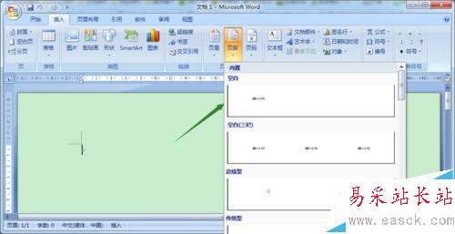 2、點擊頁腳以后,我們會看到系統內置有多種頁腳模板,我們選擇最上面的"空白頁腳",確認以后就會在文檔的最下面看到了插入選項,見下圖;