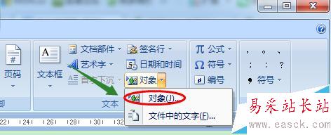 3、然后我們依舊點擊工具欄的"插入",然后在快速工具欄的"文本"選項框有一項"對象"命令,我們點擊它;