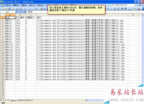 2、將通行證所需要的員工信息錄入到EXCEL中,并列出照片的路徑,需要注意的是,路徑中的"/"要以"//"代替