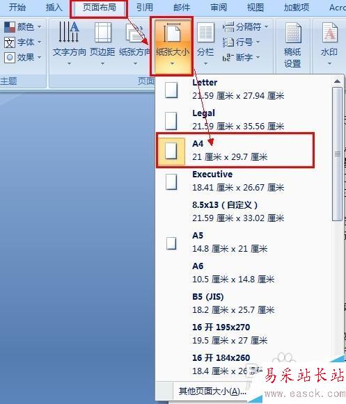 4、依次單擊“頁面布局,紙張大小,A4”,將電子板報設定為A4大小:
