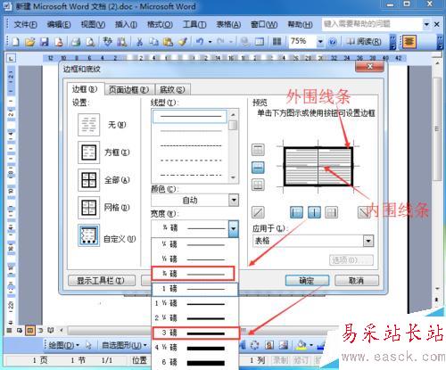 6、先把外圍邊框改為粗線,點擊“寬度”,如選擇3磅,然后在預覽圖點擊外圍四周設置邊框。 內圍十字型線條也設置下寬度,如選擇0.5磅,然后依次點擊加上線條