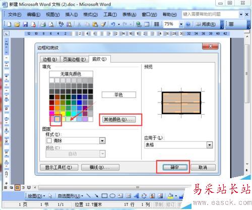 7、設置線條粗細之后,為棋牌表格添加底紋顏色,點擊“底紋”,選擇一種顏色(如茶色),或者更多顏色選擇點擊其他顏色也可,然后點擊“確定”