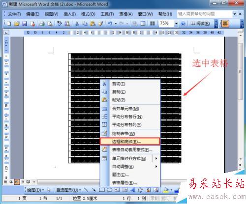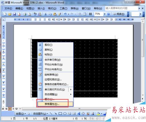 3、制作好以后,對表格先進行調整,其中圍棋的每個框都為一個小正方形。首先選中整個表格,然后右鍵點擊“表格屬性”