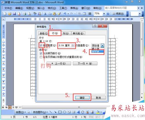 4、在打開的表格屬性窗口,點擊“行”,在指定高度前面打鉤,然后更改行高數據為0.64厘米,行高值設為“固定值”,同理點擊列,設置列寬數據為0.64厘米,點擊“確定”