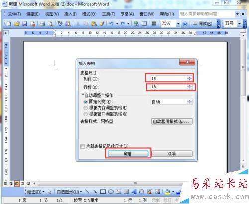 2、在打開的插入表格的窗口,更改列數為18列,行數為18行,然后單擊“確定”。