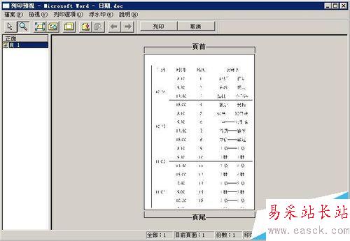 2、我們點擊打印預覽,可以看到如果不加設置直接將打印機設為A4打印,那么結果就如圖所示,只有部分表格被打印出來;
