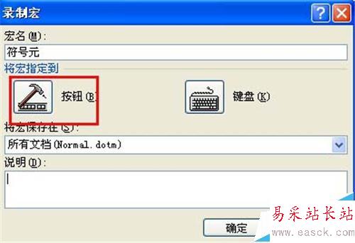 2、彈出“錄制新宏”對話框,輸入宏名“符號元”,單擊“將宏指定到”--“按鈕”