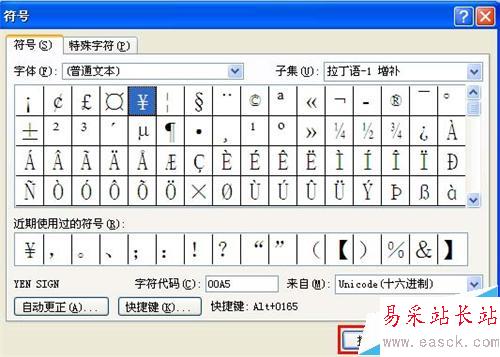 6、彈出“符號”對話框,找到“¥”,單擊“插入”