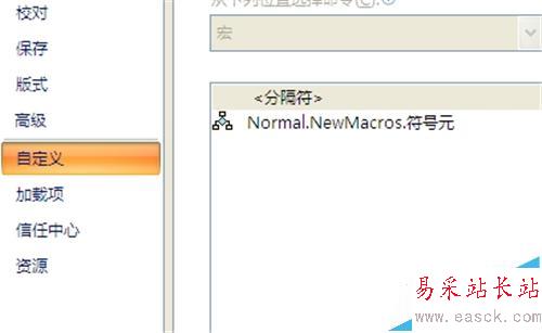 3、彈出“word”選項對話框,單擊“自定義”,將“我的文檔格式”添加到“自定義快速訪問工具欄”中,單擊“確定”始錄制新宏