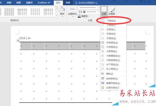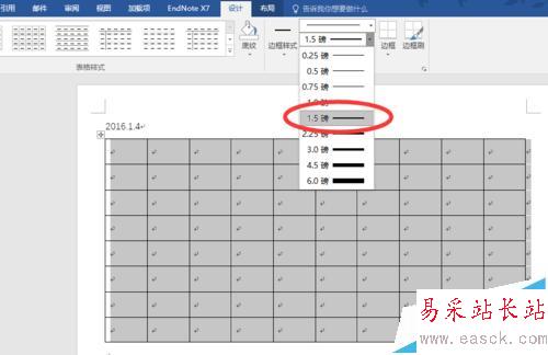 2、選中表格,點擊設計,在邊框中的筆畫粗細選擇1.5磅,然后在邊框下拉框先選擇無框線,再選擇上框線和下框線。然后筆畫粗細選擇0.5磅,選中第一行后,在邊框中選擇下框線。表格樣式中的清單表6,如圖。