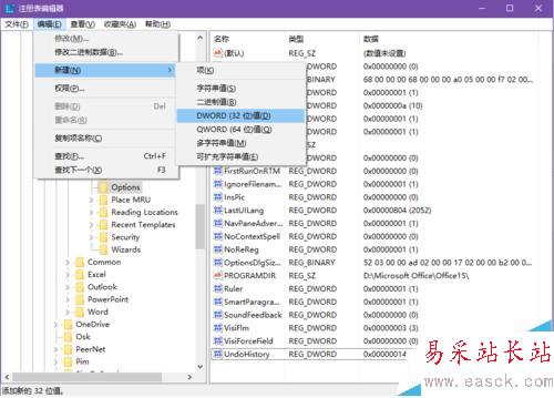 4、在“編輯”菜單上,指向“新建”,然后單擊“DWORD 值”。選擇上更改“新值 #1”,鍵入 UndoHistory,然后按 確認。