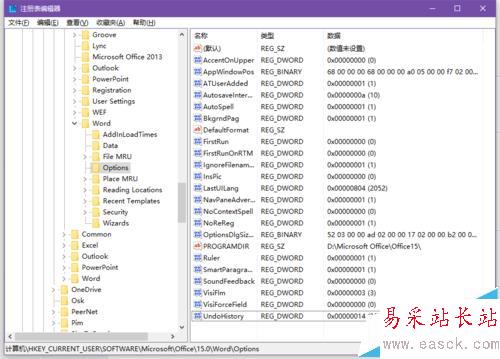 3、在注冊表編輯器中,展開到下列注冊表子項:HKEY_CURRENT_USER/Software/Microsoft/Office/15.0/Word/Options