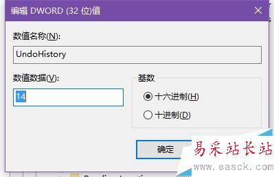 5、在“編輯”菜單上,單擊“修改”。在“編輯 DWORD 值”對話框中,單擊“基數”下的“十進制”。在“值”框中鍵入一個介于 0 和 100 之間的值,單擊“確定”,然后退出注冊表編輯器。 這個值是Undo(可撤銷)的次數,不建議設置的太大,一般設成10即可。太大會占用較多的內存資源。