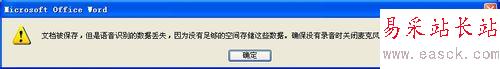在Word文檔的保存過(guò)程中,出現(xiàn)這樣的一個(gè)錯(cuò)誤對(duì)話框:“文檔被保存,但是語(yǔ)音識(shí)別的數(shù)據(jù)丟失,因?yàn)闆](méi)有足夠的空間存儲(chǔ)這些數(shù)據(jù),確保沒(méi)有錄音時(shí)關(guān)閉麥克風(fēng),并檢查磁盤(pán)上的可用存儲(chǔ)空間。”相信有很多朋友都遇到過(guò)和我類(lèi)似的問(wèn)題,這里把解決方法和大家說(shuō)下,以免大家保存文件受到不必要的影響。