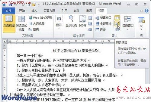 第3步,在其中一個Word2010文檔的“窗口”分組中單擊“并排滾動”按鈕,則可以實現(xiàn)在滾動當(dāng)前文檔時另一個文檔同時滾動,如圖2009120314所示。