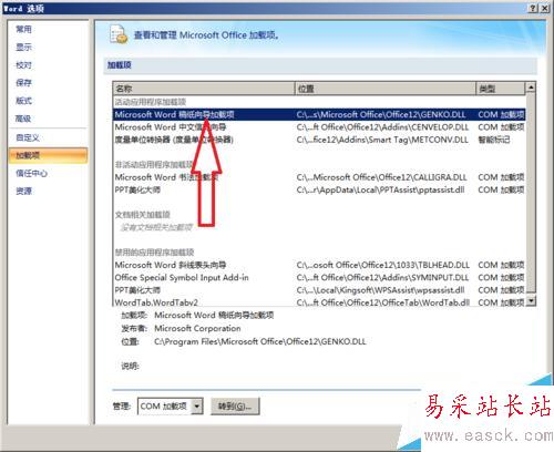 2、在彈出窗口中選擇“稿紙向導加載項”如下圖箭頭所指。