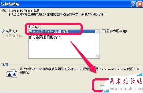 7、選擇Microsoft Visio 繪圖對(duì)象,確定即可。這樣粘貼出來的就不會(huì)是亂碼了。