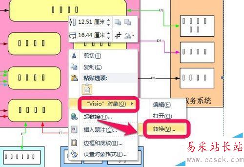 3、選擇這個(gè)visio圖片,右鍵下拉菜單——》visio對(duì)象——》轉(zhuǎn)換。如圖。