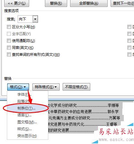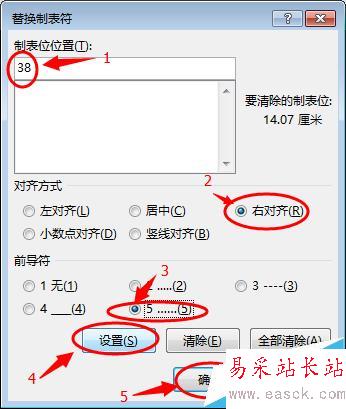 4、在【格式】下拉菜單中選擇 制表位 選項,彈出替換制表符對話框,在【制表位位置】輸入38(數值可以根據自己需要調整大?。?;【對齊方式】選擇右對齊;【前導符】選擇5【......】,然后單擊設置按鈕,并點擊確定關閉對話框。