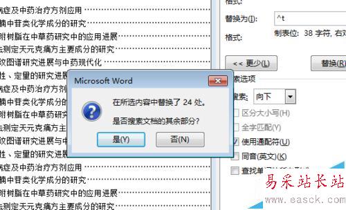 5、回到【查找和替換】窗口,在【替換為】文本框中輸入 ^t ,單擊下面【使用通配符】前的復選框打鉤,最后單擊 【全部替換】按鈕。這時如果彈出對話框,詢問是否替換其他位置,可以根據需要選擇 是 或者 否。