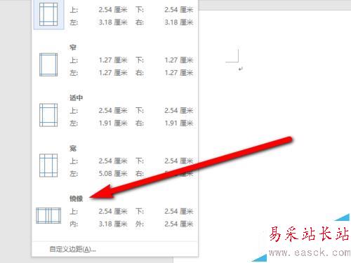 2、如果想更改對稱頁邊距的寬度,可以再單擊“頁邊距”庫底部的“自定義邊距”。在“內部”和“外部”框中輸入新值。