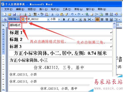 2、然后點(diǎn)擊格式工具欄最前方的倒三角,出現(xiàn)一個(gè)菜單,然后單擊“清除格式”按鈕。