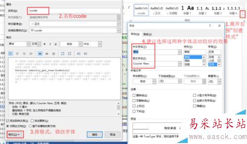 2、當前文檔新定義一個樣式,命名為"code",專門用來對代碼進行格式化。由于是代碼,所以推薦中文使用黑體(注釋等),而英文使用等寬字體(courier new)。步驟如圖。