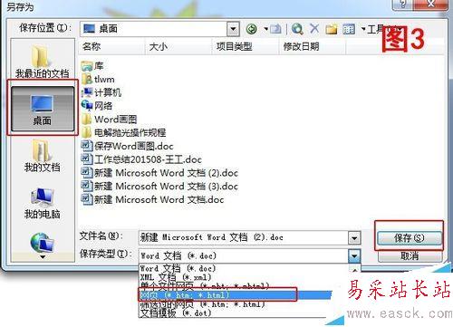 3、在“另存為”對話框中,我們選擇保存類型為“網頁(*htm;*html)”,如圖3所示,選好保存的位置,然后點擊保存按鈕。