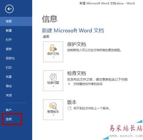 2、新開一個文檔,左鍵點擊左上角的“文件”,進入下面的頁面,點擊最下面的“選項”,進入“Word 選項”