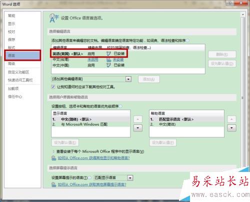 3、點擊“語言”,可以看到右邊編輯語言下面是“英語(美國)<默認>”,問題就出現在這個默認那里!