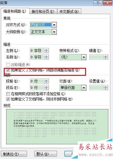 2、段落“縮進(jìn)與間距”選項(xiàng)卡中,查找“如果定義了文檔網(wǎng)格,則對齊到網(wǎng)格”,如果這一項(xiàng)前面的選框有勾選,請取消。 點(diǎn)擊“確定”。