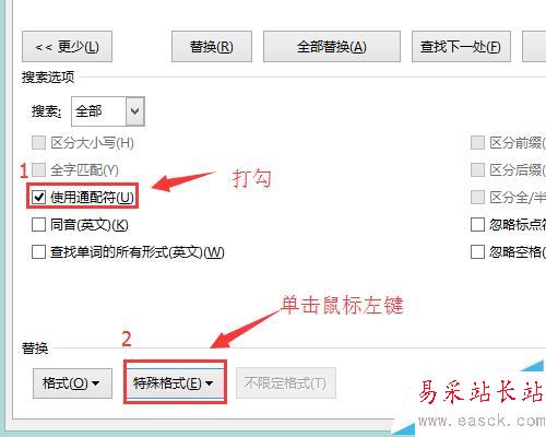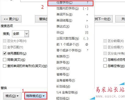 4、單擊鼠標左鍵之后,會顯示如下信息,之后單擊“特殊格式”,選擇"任意字符?"如下圖所示:
