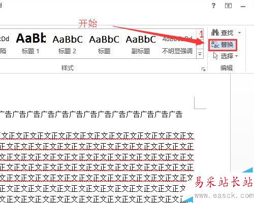 1、打開其要刪除廣告的文檔,點擊開始中選擇最右邊的“替換”或者按鍵盤上的Ctrl鍵+H鍵,如下圖所示: