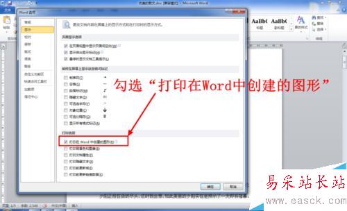 5、進入顯示選項卡后,在下方有一組打印選項。首先勾選打印選項里的“打印在Word中創建的圖形”。