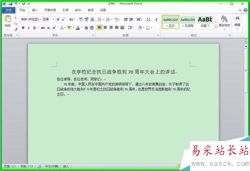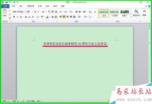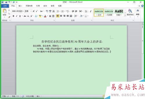 2、輸入標題:在學校紀念抗日戰爭勝利70周年大會上的講話,按Ctrl+E鍵使標題居中;
