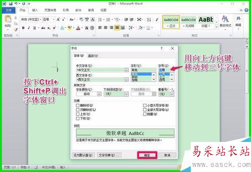 1、在打開的Microsoft Word 2010窗口,按下鍵盤上的Ctrl+Shift+P鍵,調出字體窗口,用向上方向鍵移動到三號字體,再回車;