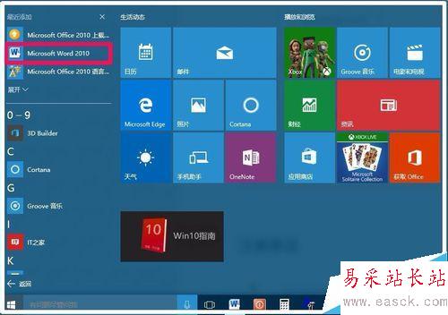 4、我們再用鍵盤上的方向鍵移動到Microsoft Word 2010,回車,就可以打開Microsoft Word 2010的編輯窗口了。