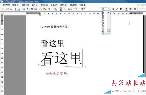 4、下拉字號(hào)選框單,看到數(shù)字72,點(diǎn)擊如下圖。