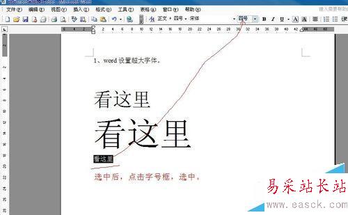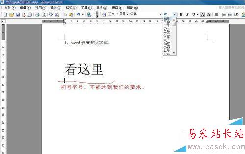 3、點(diǎn)擊改變字號(hào)的選框,這時(shí)我們看字號(hào)選項(xiàng)里有最大的初號(hào),點(diǎn)擊如下圖。