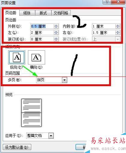 3、根據(jù)文件的方向選擇“紙張方向”,一般默認(rèn)即可;頁碼范圍選擇“拼頁”。根據(jù)文檔的具體情況適當(dāng)調(diào)整頁邊距,使兩截盡量居中。