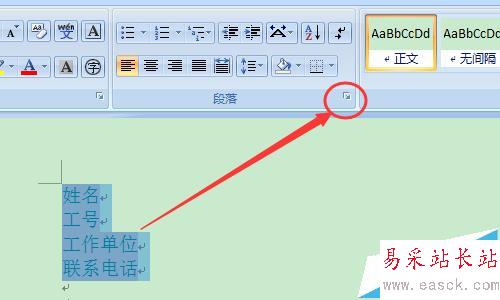 2、選中文字,單擊開始選項卡中的段落組右下角按鈕。