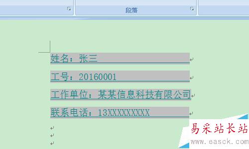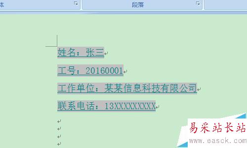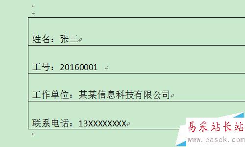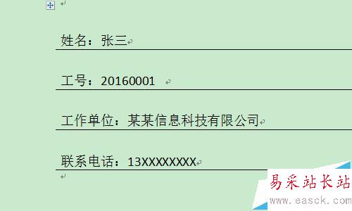 7、我們發(fā)現(xiàn)上面的文字下劃線都是緊緊跟著文字的,我們可以通過空格實現(xiàn)下劃線等長。我們發(fā)現(xiàn)這樣有點麻煩,一個人的還可以,如果很多這樣的信息就比較麻煩了,而且發(fā)現(xiàn)長度也略有差異。
