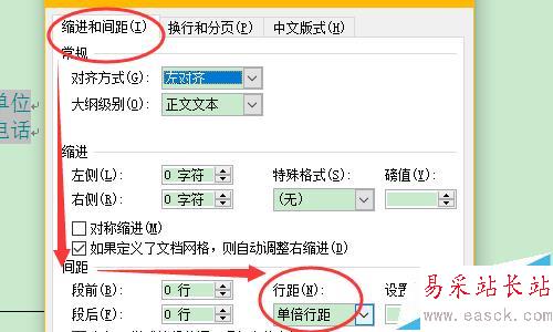 3、在段落對話框中的第一個頁簽“縮進和間距”中的間距里,行距由單倍行距改為成1.5倍行距。