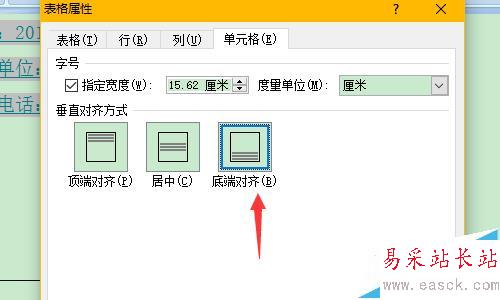 11、同樣在表格屬性對話框中,單元格頁簽,設(shè)置表格文字的垂直對其方式,設(shè)置成底端對齊。